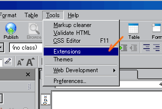 一番上のメニューバーにある"Tools"のタブをマウスでクリックし、続いてExtensionsの項目を選択し、クリックします。