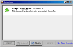 言語ファイルがインストールされました。xボタンを押してこのウインドウを閉じます。KompoZerもいったん終了し、再起動させると、日本語環境が得られます。(注意:再起動するまでは日本語表示になりません。)